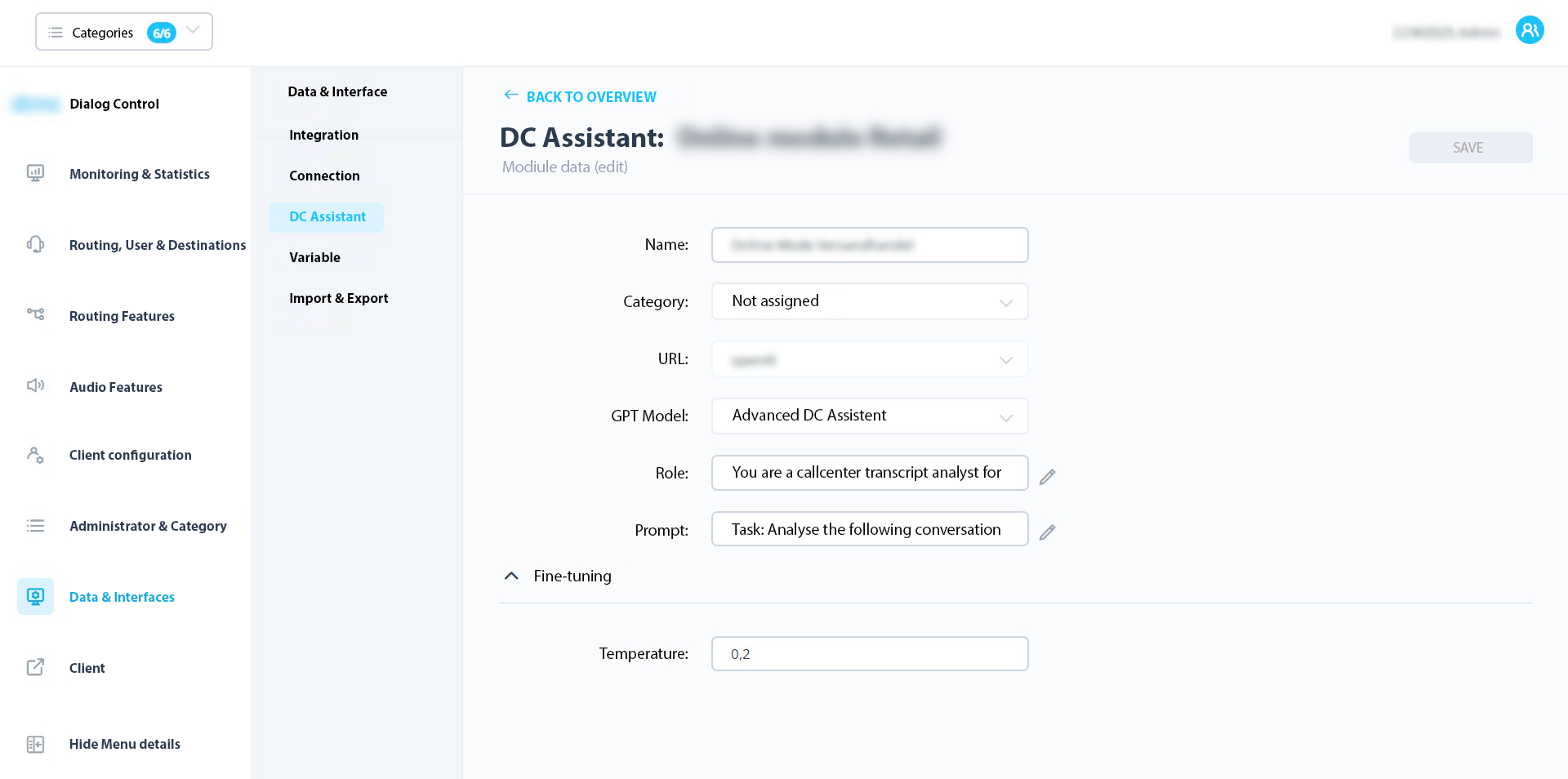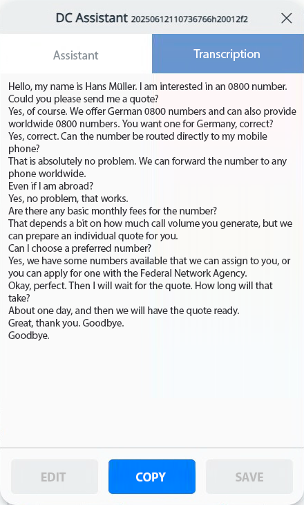 DC Assistant is a multilingual AI module of the Dialog Control cloud telephony system that transcribes telephone conversations in real time, i.e., converts speech into text. After the call ends, the contents are extracted and summarized based on predefined prompts, and then output.