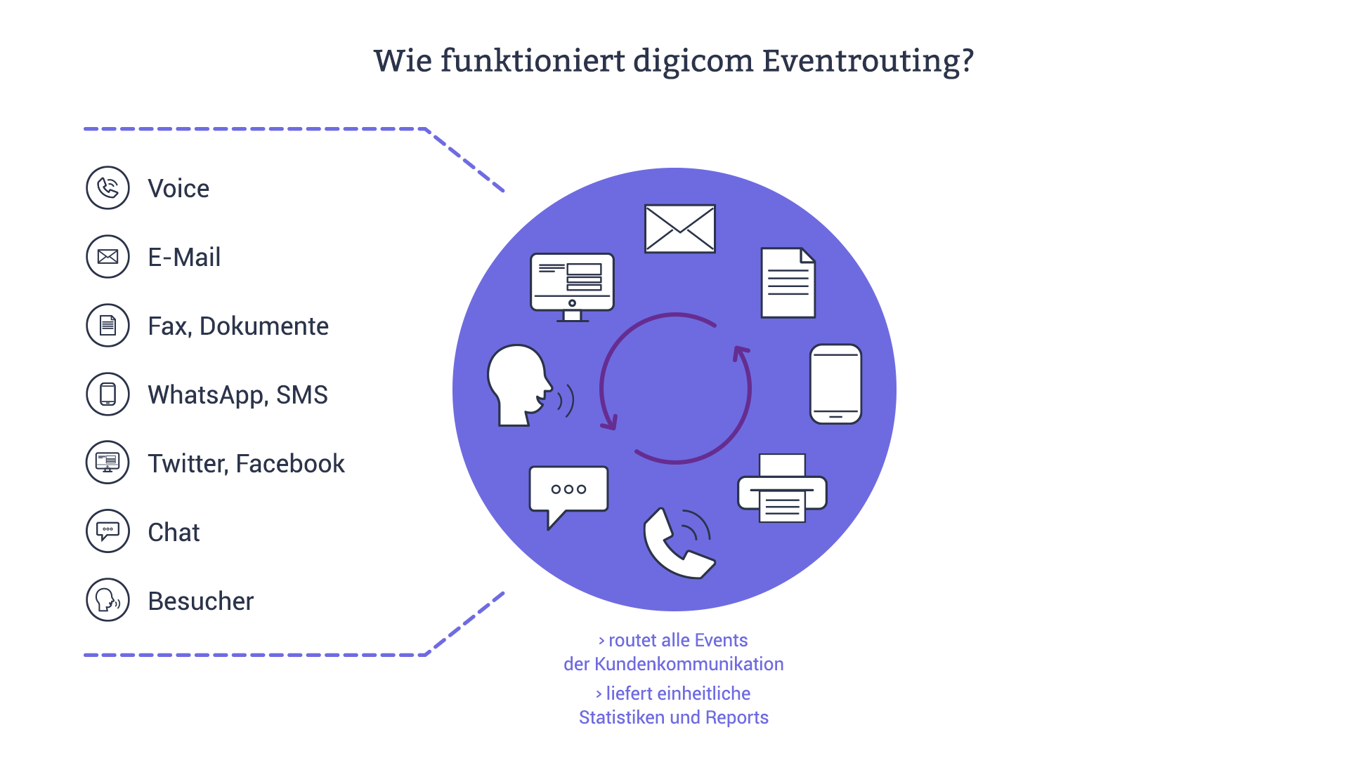Im digitalen Zeitalter sind die Ansprüche an einen reibungslosen Kundendialog so hoch wie nie zuvor. Ihr Unternehmen besteht aus einem komplexen Gefüge von Prozessen, Kontaktkanälen und Systemen. Wir haben eine Lösung, die Ihre vorhandenen Bausteine nahtlos miteinander verknüpft und alle Informationen und Abläufe unter einer Oberfläche vereint. Von E-Mail, Telefon, Fax über Chat und Social Media bis zum persönlichen Besuch. digicom führt alle diese Kontaktkanäle zusammen und bündelt sie in einem einheitlichen System. Dabei können Ihre vorhandenen Einzelsysteme genutzt werden. Ziel ist es, die wichtigsten Grundlagen für Entscheidungen aufzuzeigen, um eine langfristige Investitionssicherheit zu gewährleisten – unabhängig von Unternehmensgröße und Branche.